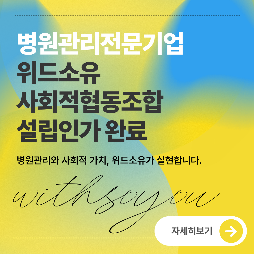 병원관리전문기업 사회적협동조합 위드소유가 설립 인가를 완료하고, 2025년 1월 1일부터 본격적인 운영을 시작하였습니다.위드소유는 병원 건물관리, 시설안전, 환경미화, 인력파견 등 병원 환경 전반에 특화된 통합 관리 서비스를 제공하는 전문기업입니다. 병원 특성상 24시간 운영과 높은 위생·안전 기준이 요구되는 만큼, 현장 중심의 체계적인 관리 프로세스와 숙련된 인력을 기반으로 안정적이고 지속 가능한 서비스를 구현하고 있습니다.출범 직후, 매그너스재단과 편안한요양병원의 관리 수탁 계약을 연이어 체결하며, 병원관리 전문기업으로서의 입지를 빠르게 확보했습니다. 이 계약은 위드소유가 보유한 전문성, 현장 대응력, 그리고 투명한 운영 체계에 대한 시장의 신뢰를 입증하는 성과이며, 향후 병원관리 시장에서의 경쟁력을 강화하는 중요한 전환점이 될 것입니다.앞으로 위드소유는- 투명한 경영: 모든 계약·비용 집행 과정의 명확한 공개- 전문 인력 운영: 의료기관 환경에 특화된 인력 양성 및 배치- 스마트 관리 시스템: GPS 기반 근태관리, 전자결재, 실시간 업무보고 시스템 도입을 통해 병원 현장에서 요구하는 고품질·고효율 서비스를 지속적으로 제공합니다.또한, 지역사회 고용 창출과 사회적 가치 실현이라는 사회적협동조합의 설립 취지에 맞춰, 취약계층 고용 확대와 지속 가능한 일자리 제공에도 앞장서겠습니다. 위드소유는 병원과 지역사회의 동반 성장을 목표로, 현장에서 인정받는 ‘병원관리의 표준’을 만들어 나가겠습니다.문의처사회적협동조합 위드소유 홍보팀☎ 02-990-7901 ✉ hello@soyoupartners.com